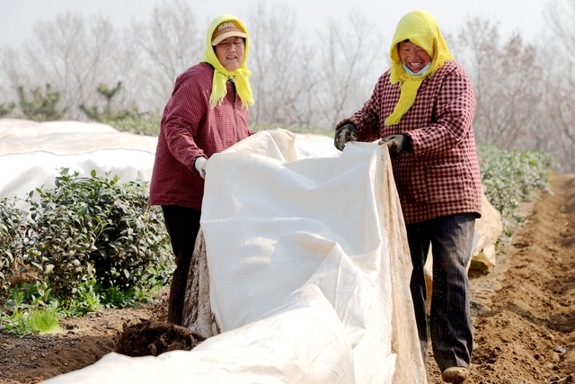 春风送暖,茶芽待醒。3月10日,位于日照市的圣谷山南山茶园里一派繁忙景象,十余名茶农手持工具,正有条不紊地解开覆盖在茶树上的越冬暖棚,为即将到来的春茶采摘季做好准备。