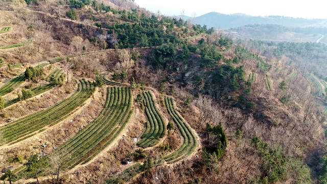 随后,记者来到位于深山中的大梁山有机茶园,越冬棚已全部撤去,褪去了冬日“外衣”的茶树更显舒展。北方春日迟,虽已至阳春三月,但茶山仍裹挟着几分冬末的清冽。多数草木尚未返青,唯有松树与茶树新绿肆意铺展,勾勒出半黄半绿的春日茶山生机画卷。