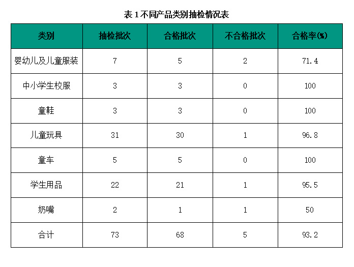 儿童节前夕,青岛市城阳区市场监督管理局对辖区内生产及流通领域的儿童用品进行了抽样检验工作,共抽取73批次儿童用品,主要涉及婴幼儿及儿童服装、中小学生校服、童鞋、儿童玩具、童车、学生用品、奶嘴,其中合格68批次,不合格5批次,合格率为93.2%。