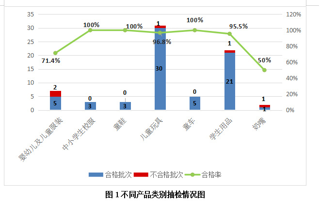本次儿童用品监督抽查,儿童玩具抽检数量最多,共抽检31批次,合格30批次,合格率为96.8%;婴幼儿及儿童服装、奶嘴产品抽检合格率较低,婴幼儿及儿童服装共抽检7批次,合格5批次,合格率为71.4%,奶嘴共抽检2批次,合格1批次,合格率为50%。具体情况见下表1及图1。