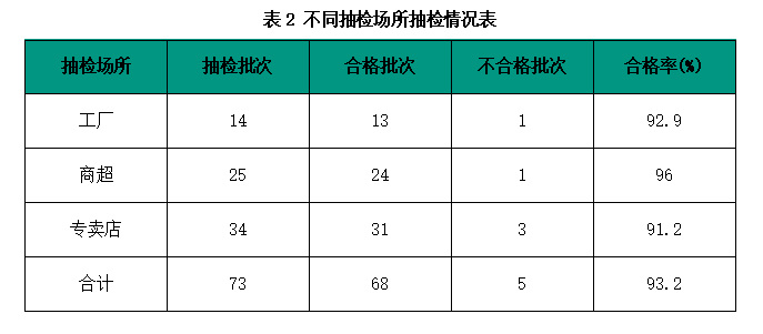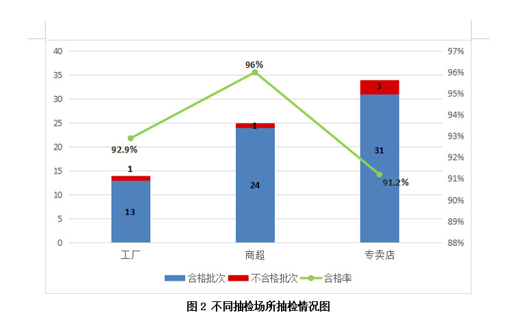 本次儿童用品监督抽查包括生产领域抽样及流通领域抽样,其中生产领域工厂共抽检产品14批次,合格13批次,合格率为92.9%;流通领域商超共抽检产品25批次,合格24批次,合格率为96%;流通领域专卖店共抽检产品34批次,合格31批次,合格率为91.2%。具体情况见下表2及图2。