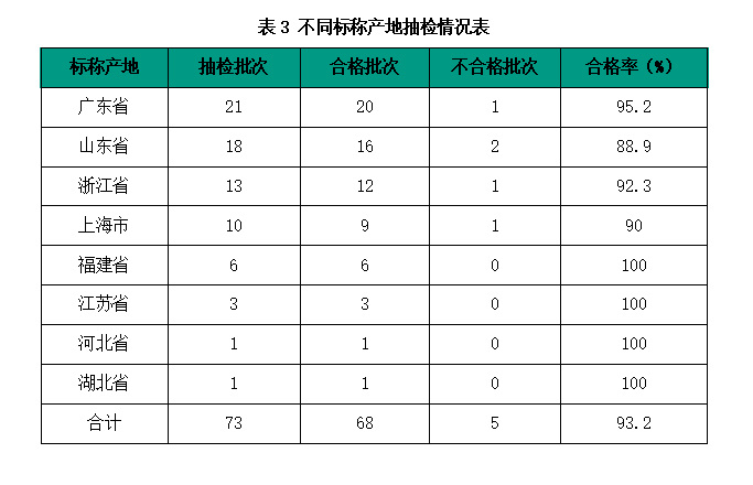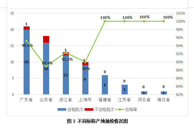 本次抽检产品标称产地包括广东省、山东省、浙江省、上海市、福建省、江苏省、河北省、湖北省8个省市,其中广东省抽检产品最多,共抽检21批次,合格20批次,合格率为95.2%。具体各标称产地抽检情况见下表3及图3。