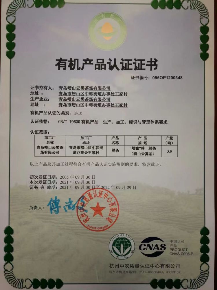 青岛崂山云雾茶场连续18年进行有机茶认证,是崂山区具有代表性的有机茶生产示范基地。崂山是我国大陆海岸线上唯一海拔超千米的高山,山青海碧,云雾缭绕,气候适宜,有着茶叶生长的最优环境。崂山也是中国纬度最高的规模茶产区,生长周期长,加上富含矿物质的天然泉水滋养,造就了崂山茶色、香、味、形俱佳的极优品质。有机崂山茶品质优质,饮用更安全。
