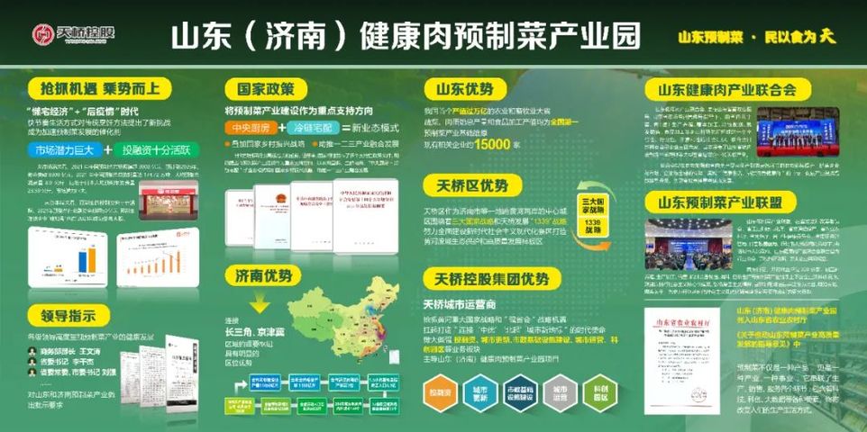 为响应政策号召,适应新时代发展需要,推动山东预制菜产业高质量发展,加快构建预制菜产业发展体系,山东健康肉产业联合会、山东预制菜产业联盟乘势而上,联合天桥控股集团有限公司,按照“紧盯前沿、延链谋划,龙头带动、培育壮大,打造生态、集群发展”思路,在济南天桥区药山工业园区共同打造山东(济南)健康肉预制菜产业园,实现“国内标杆、国际领先、世界一流”的目标定位。