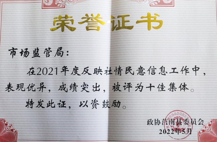 莒南县市场监管局获评县政协2022年度反映社情民意信息工作十佳集体