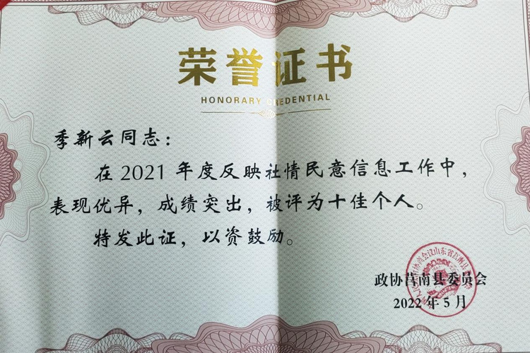 在5月20日召开的县政协2022年度宣传暨反映社情民意信息工作会议上,县市场监管局获评“2021年度反映社情民意信息工作十佳集体”,该局质量发展和标准化科季新云荣获“2021年度反映社情民意信息工作十佳个人”。